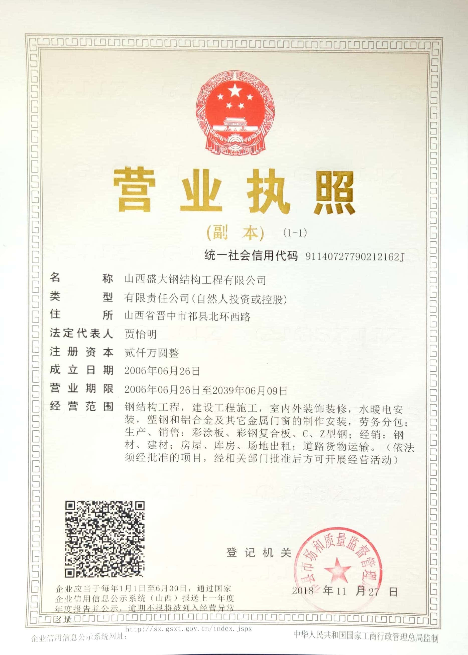 山西盛大鋼結(jié)構(gòu)工程有限公司 山西盛大鋼結(jié)構(gòu)工程有限公司成立于1996年,坐落于國家歷史文化名城——山西祁縣。擁有兩大智能化鋼結(jié)構(gòu)生產(chǎn)基地,占地110畝,建筑面積3萬余平方米,具備鋼結(jié)構(gòu)專業(yè)承包貳級、建筑工程施工總承包貳級資質(zhì),是一家集設(shè)計、制造、施工于一體的大型鋼結(jié)構(gòu)工程企業(yè)。 盛大鋼構(gòu)是中國鋼結(jié)構(gòu)協(xié)會會員單位,山西鋼結(jié)構(gòu)協(xié)會副會長單位,山西建筑企業(yè)商會理事單位,山西省土木建筑學(xué)會會員單位,擁有國家知識產(chǎn)權(quán)局注冊商標。公司已通過ISO9001質(zhì)量管理體系認證,體系覆蓋鋼結(jié)構(gòu)加工與施工等核心… more +